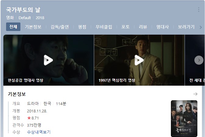 우리나라에 가장 큰 경제 위기라고 하면 여러분은 어떤 것을 생각하십니까? 우리 주변에 연세가 90~100세가 넘으신 분들은 아주 여러 가지를 이야기하실 수 있을 것 같습니다. 그분들은 일제강점기, 8.15 해방, 6.25등 우리나라 현대의 모든 것을 겪으신 분들이기 때문입니다. 정말 그분들은 현대를 관통하는 분들이라고 할 수 있습니다. 다른 시점으로 본다면 우리나라는 근 100년간 엄청난 변화를 겪은 것입니다. 각설하고 저는 대한민국의 가장 큰 경제 위기라고 하면 IMF 외환위기라고 생각합니다. 그 상황을 다룬 영화 국가부도의 날입니다.