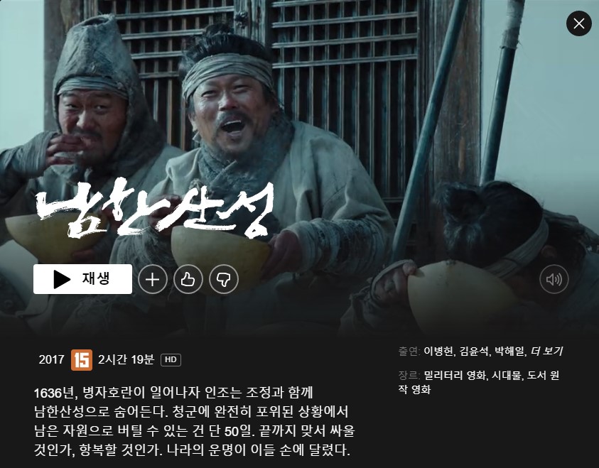 2017년 개봉한 남한산성입니다. 상업적으로 흥행하지는 못했지만 작품성을 인정받은 작품입니다. 왜 잘되지 못했는가라고 하면 이야기가 전반적으로 어둡고 전투가 있지만 역사를 스포일러 삼아 질 것을 알기에 그런 것 같습니다. 일단 뭐든 이겨야 재미있으니까요.
