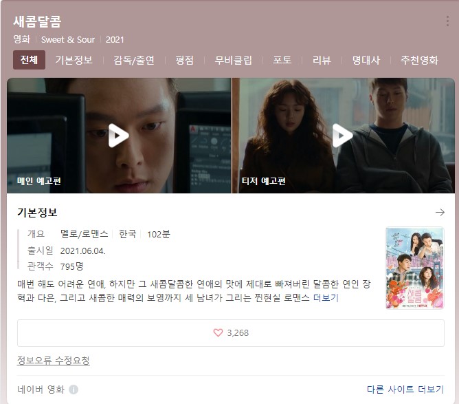 저는 영화 추천을 유튜브에서 많이 받습니다. 알고리즘이 참 신기해서 가끔씩 보는 영화 추천과 리뷰를 잊을만하면 보여줍니다. 오늘 소개해 드릴 영화 새콤달콤은 그래서 보게 된 영화입니다. 제목만 들어도 사랑이야기란 것을 알 수 있을 것 같습니다. 맞습니다. 현실적인 남녀의 사랑이야기인데 몇 가지의 트릭과 반전이 숨어있습니다. 어떤 영화인지 알아보겠습니다.