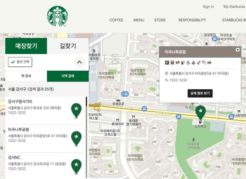 4. 그러면 해당 지역에 있는 매장들의 리스트가 보이는데 그중 하나를 클릭합니다. 그러면 우측의 지도에 해당 매장이 보입니다.