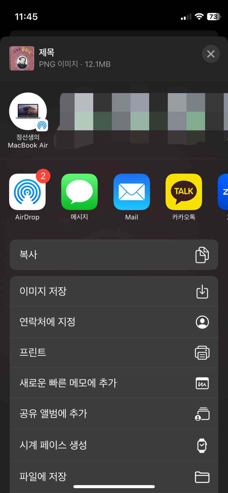 복사를 누르고 나면 메모장을 열어 붙여 넣기 할 수 있습니다. 그런데 굳이 이렇게 할 필요가 없는 것이 공유를 선택하면 '새로운 빠른 메모에 추가'라는 항목이 있어 쉽게 할 수 있습니다. 또한 에어드롭으로 다른 기기로 보내거나 문자, 메일, 카톡을 비롯한 다른 앱들에 보낼 수 있고 이미지로 저장도 가능합니다. 애플워치가 있다면 시계페이스로도 설정가능하고요.