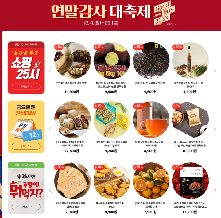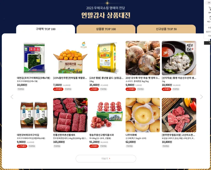 그 외에도 '연도대전 수상업체 특별전'과 '연말 감사 상품대전'으로 '구매액 탑 100', '상품평 탑 100', '신규상품 탑 50'으로 다른 분들이 많이 사고 있는 물건도 볼 수 있습니다.