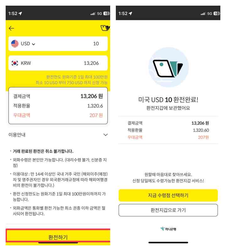 - 준비물 : 환전 신청인 명의의 하나은행 또는 타행 현금인출기능이 있는 신용/체크카드, 환전신청번호
