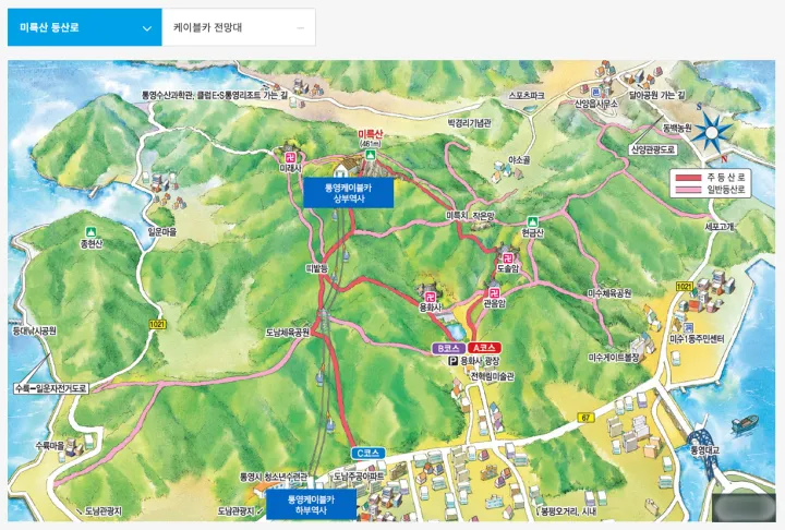 케이블카 주위의 등산로입니다. 케이블카가 편도도 운행하니 상황에 맞게 타시면 되겠습니다. 잘 안 보이는 경우 아래의 버튼을 누르면 크게 볼 수 있습니다.